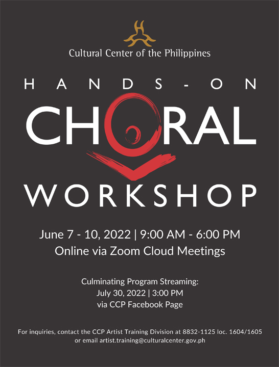 THE CULTURAL Center of the Philippines (CCP) is now accepting applications for the CCP Hands-on Choral Workshop (HOCW) 2022 which will be held online for the first time. The module includes synchronous sessions which will be on June 7 to 10, from 9 a.m. to 6 p.m. via Zoom. After this, participants will record and submit performances of songs assigned by the trainers to be showcased during the Virtual Culminating Program, to be streamed on July 30, at 3 p.m. via the CCP Facebook Page. The HOCW is a biennial intensive choral clinic open to amateur choirs and choral conductors to develop their skills in choral singing, conducting, and performance. Workshop trainers are current members and alumni of the Philippine Madrigal Singers, led by choirmaster and artistic director Mark Carpio. This year, the participants will also be provided with training on virtual and online choral music productions. Open to choirs who have been in existence for at least two years, registration is P19,000 for at most 20 choir members and the conductor. Since choir participation is on a first-come-first-served basis, choirs should pay a reservation fee of P1,000, in addition to the registration fee, to be assured of a slot. To apply, visit https://tinyurl.com/CCPHOCW2022-Application-Choir. Individual conductor applicants have an opportunity to observe selected sessions and partici-pate in mentorship sessions under Mr. Carpio. They should be musically literate and should be able to sing. The reservation fee is P2,000. To apply, visithttps://tinyurl.com/CCPHOCW2022-Apply-Individual. Slots are limited. For more information, contact the CCP Artist Training Division via e-mail at artist.training@culturalcenter.gov.ph or call 8-832-1125 loc. 1604/1605.