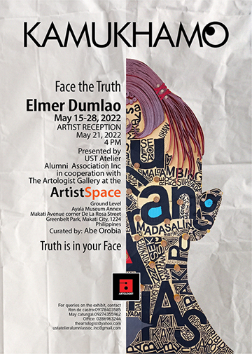 “KAMUKHAMO: Face the Truth, Truth Is in Your Face” is the 12th solo exhibition of multi-media works by Filipino visual artist Elmer Dumlao who is based in Jordan. “Kamukhamo” is on view until May 28, with an Artist’s Reception on May 21 at 4 p.m., at the ArtistSpace. Prejudice is dangerous and unforgiving, and this is what Mr. Dumlao wants viewers to reflect in his Kamukhamo series: to be more sensible, fair, cautious, and discerning yet critically caring. Concurrently working as an art director and consultant abroad, Mr. Dumlao is a multimedia artist having design projects and art exhibitions in the Middle East, Europe, and the country.