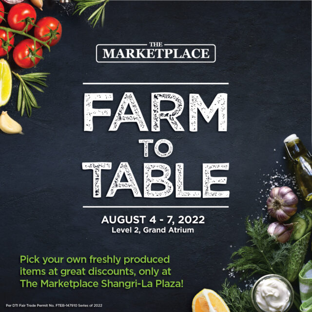 IT is all set to be a “Dealightful” month as Shangri-La Plaza’s The Marketplace is bringing back its popular Farm to Table market at the Grand Atrium on Aug. 4-7 to continue its support of local farmers. The farmers’ market features a wide range of locally grown organic products, as well as some carefully curated imported selections. It also introduces a number of new experiences for mall guests this year, including the Dizon Salad Bar that lets shoppers create their own salads using fresh ingredients on the spot. For P999, mall guests can join the Fresh Harvest All-You-Can, where they can fill their baskets with as much produce as they can in 60 seconds. This will be held on Aug. 6 from 3-9 p.m. The Marketplace is also supporting the Make-A-Wish Foundation — every purchase at Farm to Table helps fill care boxes with fruits and vegetables for children who are battling critical illnesses. For updates and inquiries, follow Shangri-La Plaza on Facebook at www.facebook.com/shangrilaplazaofficial and on Instagram @shangrilaplazaofficial.