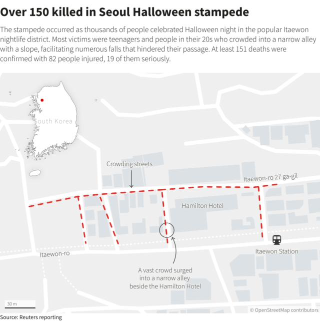 Twenty-four hours before, there were already warning signs that the festivities were attracting dangerous numbers of people. On Friday night, a Reuters witness saw crowds in the area packed toe-to-toe at a Halloween street fair with booths for face-painting and selling candy and costumes.