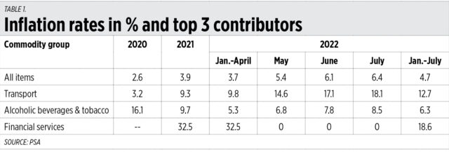Last Friday, the Philippine Statistics Authority (PSA) reported the July 2022 inflation rate at 6.4%, another four-year high from October 2018’s 6.9%. Transport and ABT are among the big inflation generators (Table 1).