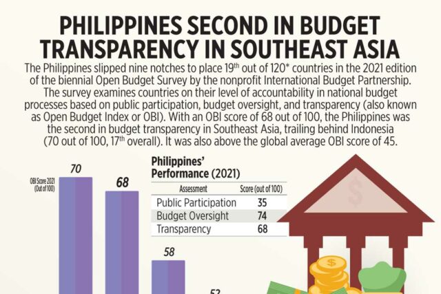The Philippines slipped nine notches to place 19th out of 120* countries in the 2021 edition of the biennial Open Budget Survey by the nonprofit International Budget Partnership. The survey examines countries on their level of accountability in national budget processes based on public participation, budget oversight, and transparency (also known as Open Budget Index or OBI). With an OBI score of 68 out of 100, the Philippines was the second in budget transparency in Southeast Asia, trailing behind Indonesia (70 out of 100, 17th overall). It was also above the global average OBI score of 45.