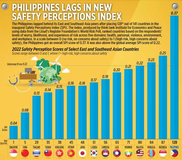The Philippines lagged behind its East and Southeast Asia peers after placing 128th out of 141 countries in the inaugural Safety Perceptions Index (SPI). The index, produced by think tank Institute for Economics and Peace using data from the Lloyd’s Register Foundation’s World Risk Poll, ranked countries based on the respondents’ levels of worry, likelihood, and experience of risk across five domains: health, personal, violence, environment, and workplace. In a scale between 0 (no risk, no concerns about safety) to 1 (high risk, high concerns about safety), the Philippines got an overall SPI score of 0.37. It was also above the global average SPI score of 0.22.