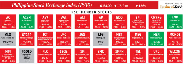 The benchmark Philippine Stock Exchange index (PSEi) plunged by 117.19 points or 1.86% to close at 6,168 on Wednesday, while the broader all shares index gave up 40.32 points or 1.19% to end the session at 3,328.35.