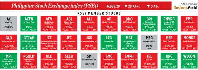 The benchmark Philippine Stock Exchange index (PSEi) fell by 29.73 points or 0.42% to close at 6,988.29 on Monday, while the broader all shares gave up 11.24 points or 0.30% to end at 3,728.21.