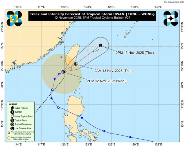 Tropical Storm Fung-wong, locally named Uwan, made its re-entry into the Philippine Area of Responsibility (PAR) on Wednesday afternoon, prompting the hoisting of Tropical Cyclone Wind Signal No. 1 in Batanes, according to the state weather bureau.