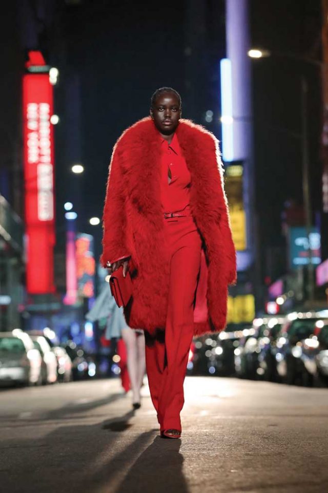 As for the clothes themselves —Michael Kors made his fortune and his future empire (eventually coming to own not only his own brand, but also Versace and Jimmy Choo) on American-style sportswear, and a showcase of the type was expected. The autumn/winter collection was a mix of dressed-up daywear (a firetruck red pantsuit coupled with a fur coat) to understated evening glamor (a fully sequined black floor-length dress). The devil is in the details: the finale dresses in gold, silver, and black are draped with men’s coats (as if women were draped with their dates’ jackets), and zooming in reveals the coats’ fully-sequined lining.