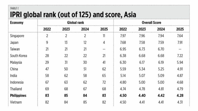 The IPRI is composed of three core components: Legal and Political Environment (LP), Physical Property Rights (PPR), and Intellectual Property Rights (IPR). I included the results for 2025 and the results of the previous three years in the accompanying table. The Philippines is not faring well mainly due to our low score in LP, meaning the legal and institutional issues that cover the extent of corruption, among other factors. So far, we are at similar level as Vietnam. (See Table 1.)