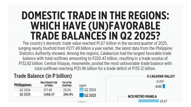 The country’s domestic trade value reached P1.07 trillion in the second quarter of 2025, surging nearly fourfold from P277.49 billion a year earlier, the latest data from the Philippine Statistics Authority showed. Among the regions, Calabarzon had the largest favorable trade balance with total outflows amounting to P220.43 billion, resulting in a trade surplus of P132.82 billion. Central Visayas, meanwhile, posted the most unfavorable trade balance with total outflows reaching P121.96 billion for a trade deficit of P135.12 billion.