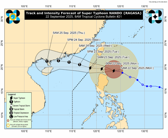 As of 8 a.m., the Philippine Atmospheric, Geophysical and Astronomical Services Administration (PAGASA) said Ragasa was spotted 180 kilometers east of Calayan, Cagayan. It was moving westward at 20 kilometers per hour (kph), packing maximum sustained winds of 215 kph and gusts of up to 265 kph.