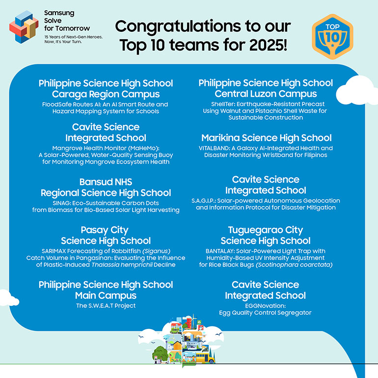 The teams that will move forward to compete for the top 3 grand-winning prizes are: FloodSafe Routes AI from Philippine Science High School — Caraga Region Campus; Mangrove Health Monitor (MaHeMo) from Cavite Science Integrated School; SINAG from Bansud NHS — Regional Science High School; SARIMAX from Pasay City Science High School; The S.W.E.A.T Project from Philippine Science High School Main Campus; ShellTer from Philippine Science High School — Central Luzon Campus; VITALBAND from Marikina Science High School; S.A.G.I.P from Cavite Science Integrated School; BANTALAY from Tuguegarao City Science High School; and EGGNovation from Cavite Science Integrated School.
