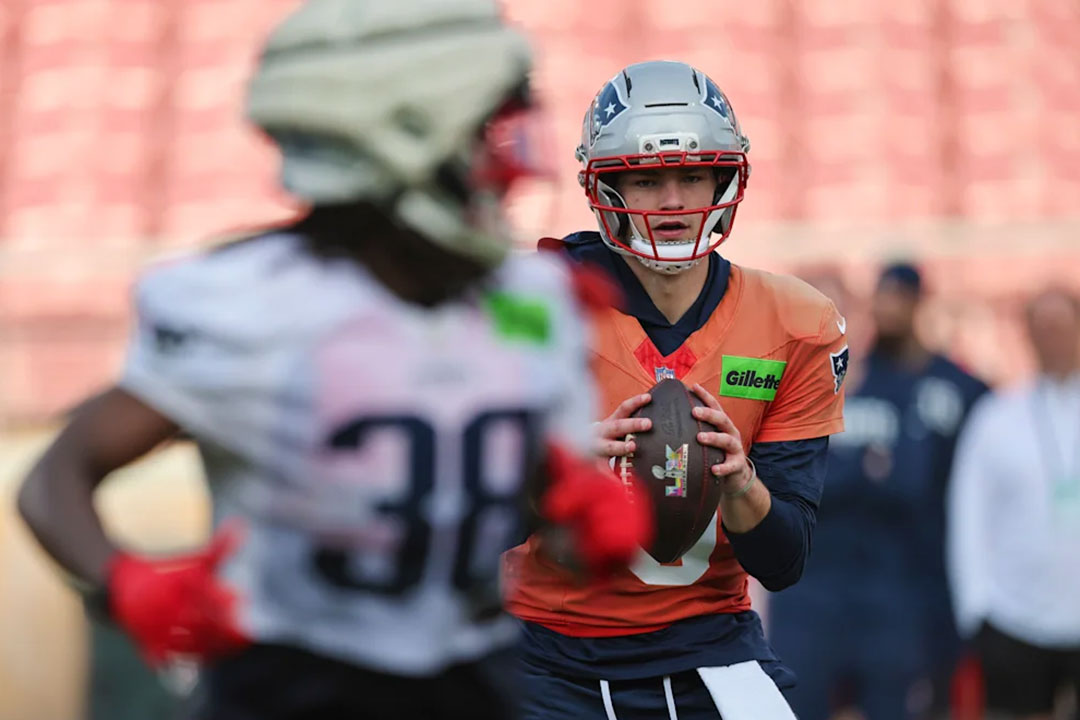 After a couple of quick snaps, players were free to mingle with their families and friends. Assistant coaches chased toddlers around the field, while a group of older children took turns hurling themselves into a tackling dummy. Offensive coordinator Josh McDaniels pulled both Maye and receiver Stefon Diggs aside to take photos with McDaniels’ kids, who range in age from 13 to 21.