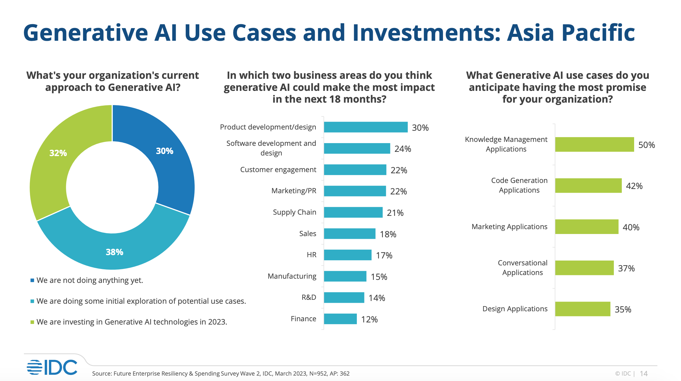 Based on the IDC study, the majority of local vendors in the Asia Pacific region, primarily from China and South Korea, are seeking to integrate their versions of Chat GPT into gaming, chat, social media, and other applications. About 70 percent of business organizations that were found to be doing some initial exploration of potential use cases are already investing in generative AI technologies in 2023.