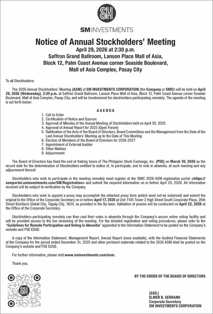 SM Investments Corp. to hold Annual Stockholders’ Meeting on April 29