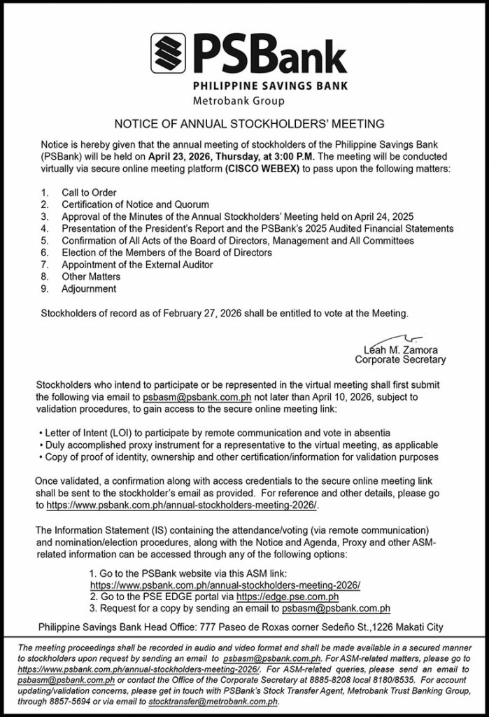 Philippine Savings Bank to hold virtual Annual Stockholders’ Meeting on April 23