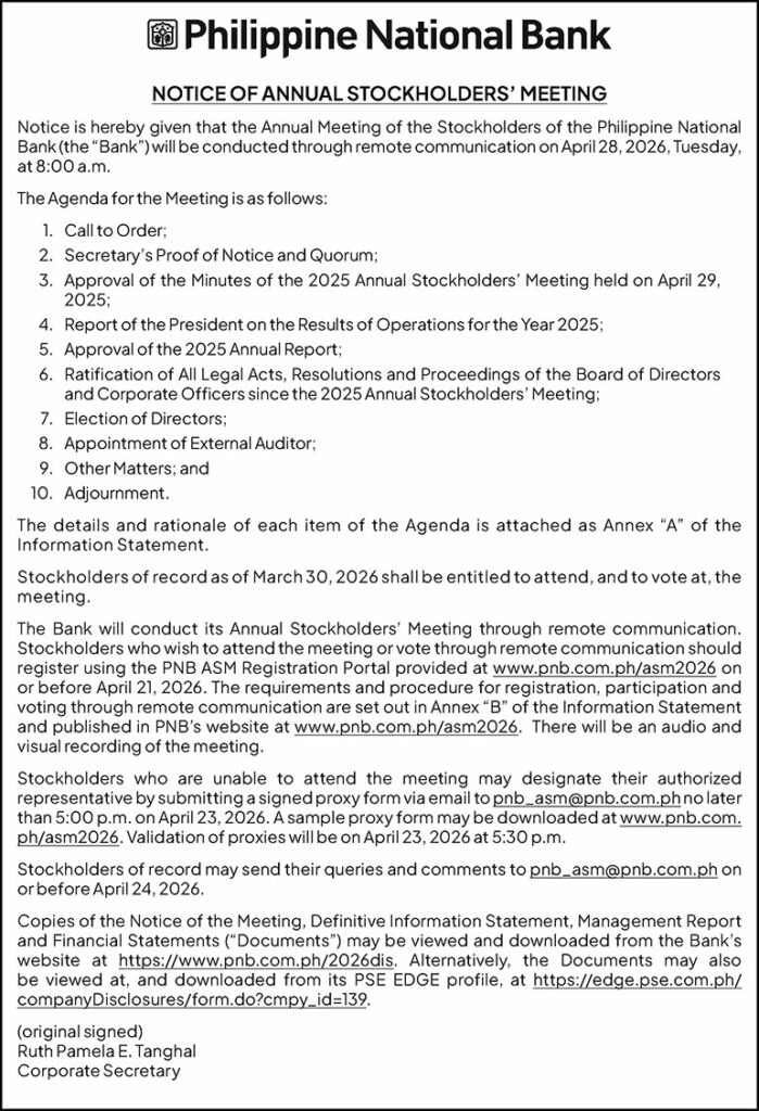 Philippine National Bank’s Annual Stockholders’ Meeting to be held on April 28 via remote communication