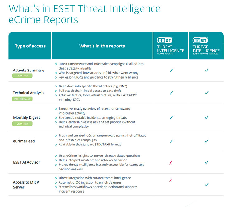 ESET’s eCrime Reports join the ESET Threat Intelligence portfolio, which includes three tiers, two of which are Premium APT Reports with in-depth analysis of global APTs, including state-aligned Russian, Chinese, Iranian, and North Korean groups. Supported by global threat hunters, these reports expose espionage activities, exploitation of vulnerabilities, and zero days, and they have been expanded to include geopolitical context. ESET also offers 18 proprietary intelligence feeds and two sub-feeds, including Android threats, IoCs, Botnets, Phishing URLs, and more.