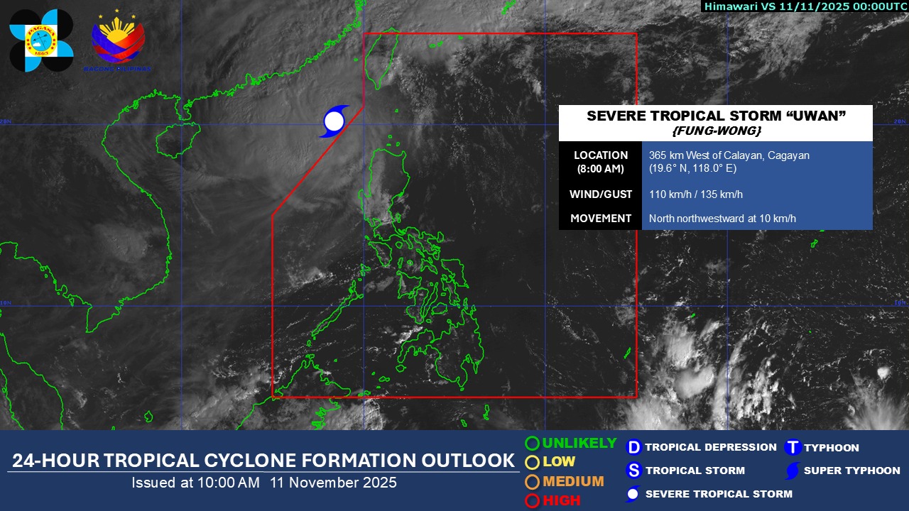 Fung-wong, packing sustained winds of 110 kilometers per hour (kph) and gusts of up to 135 kph, was last located 365 kilometers west of Calayan, Cagayan, moving north-northwestward at 10 kph, PAGASA said in its 8:00 a.m. advisory.