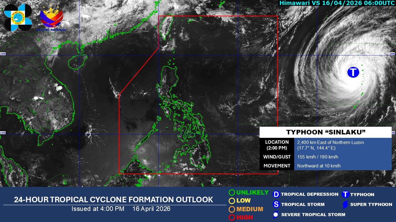 Sinlaku was last located 2,420 kilometers north of Luzon, moving northward at 10 kilometers per hour (kph), the Philippine Atmospheric, Geophysical and Astronomical Services Administration (PAGASA) said in its 5 p.m. media briefing on Thursday.