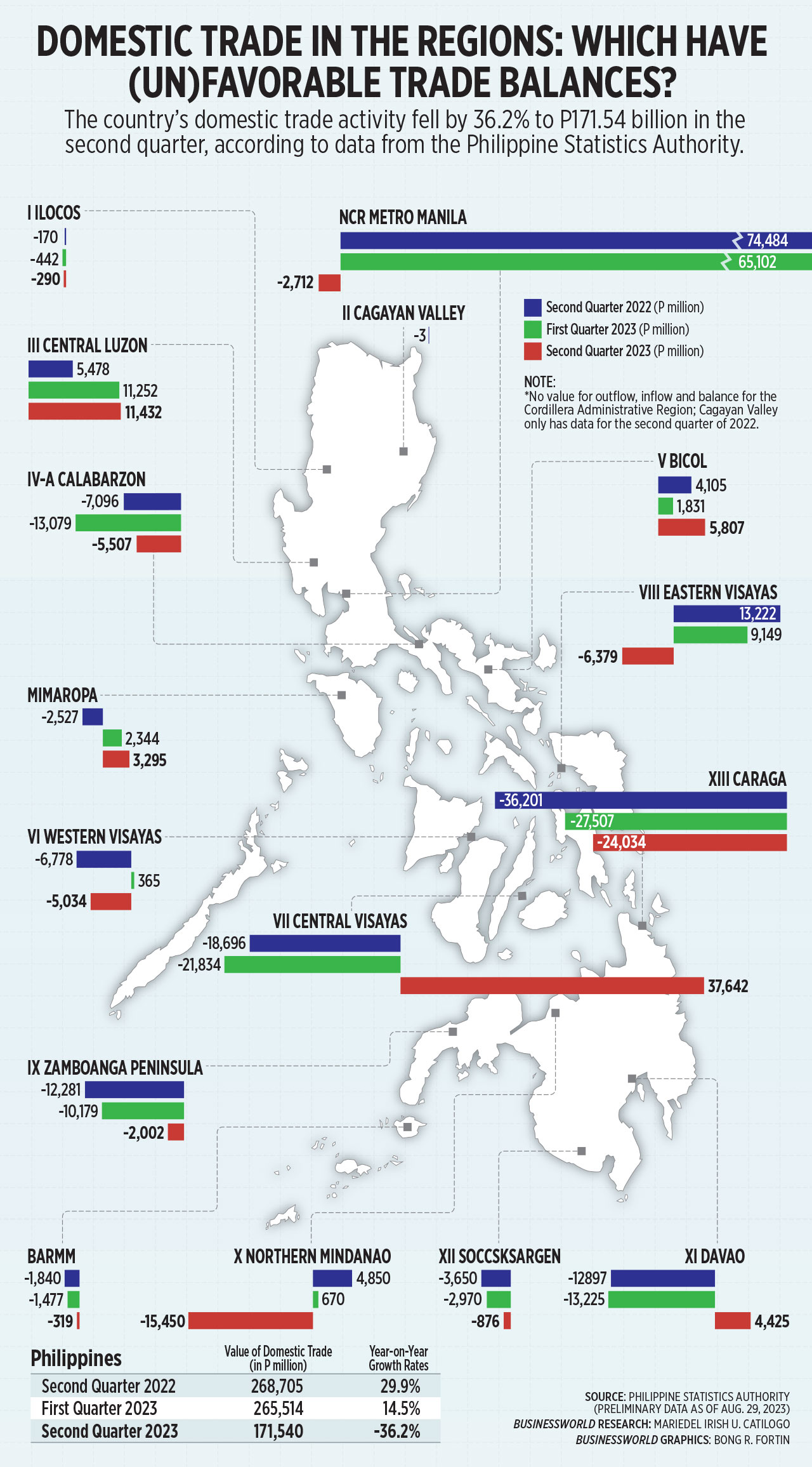Three regions had the biggest negative trade balance, led by Caraga (-P24.03 billion), Northern Mindanao (-P15.45 billion) and Eastern Visayas (-P6.38 billion). — MIUC