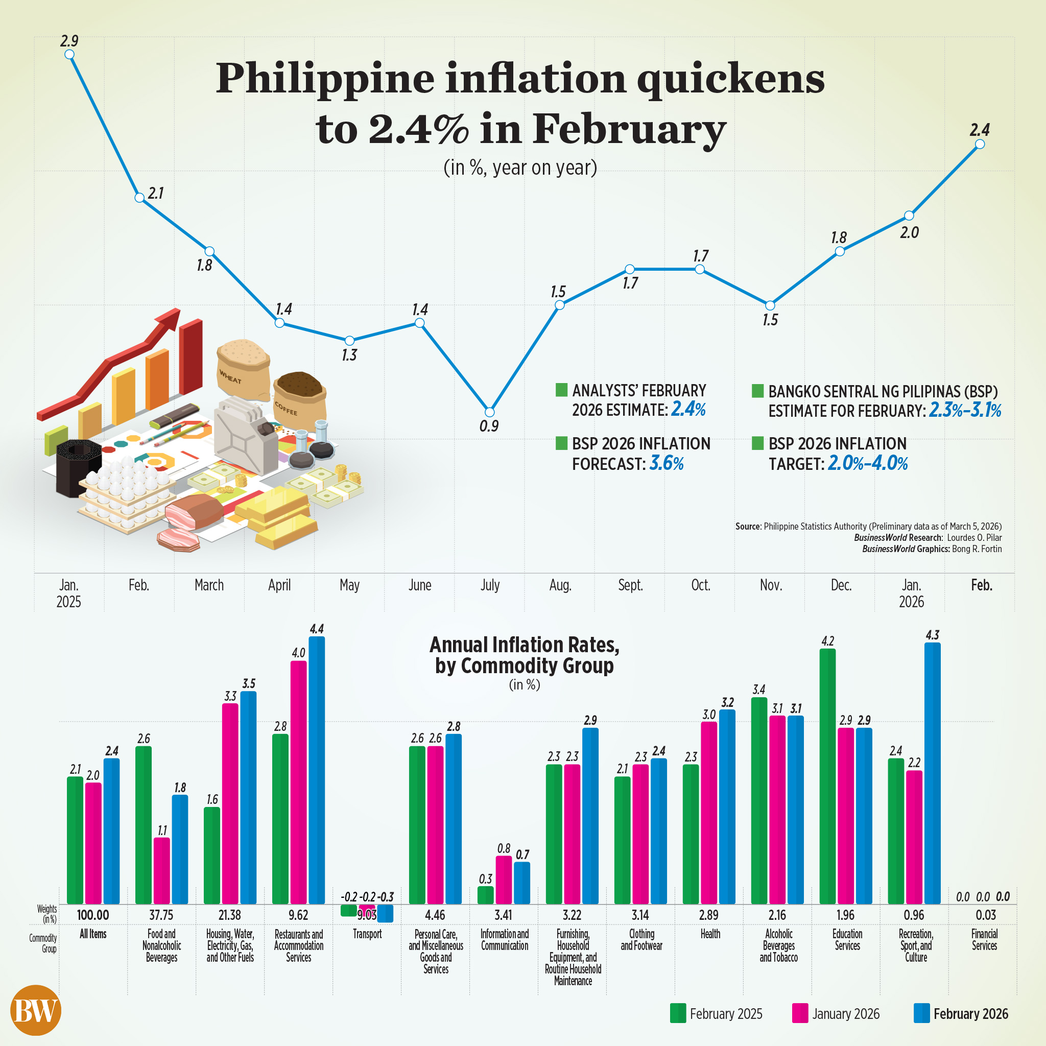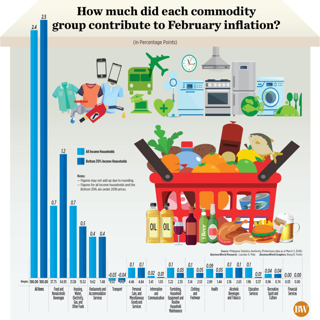 February inflation fell within the Bangko Sentral ng Pilipinas’ (BSP) 2.3%-3.1% forecast and matched the 2.4% median estimate in a BusinessWorld poll of 17 analysts.