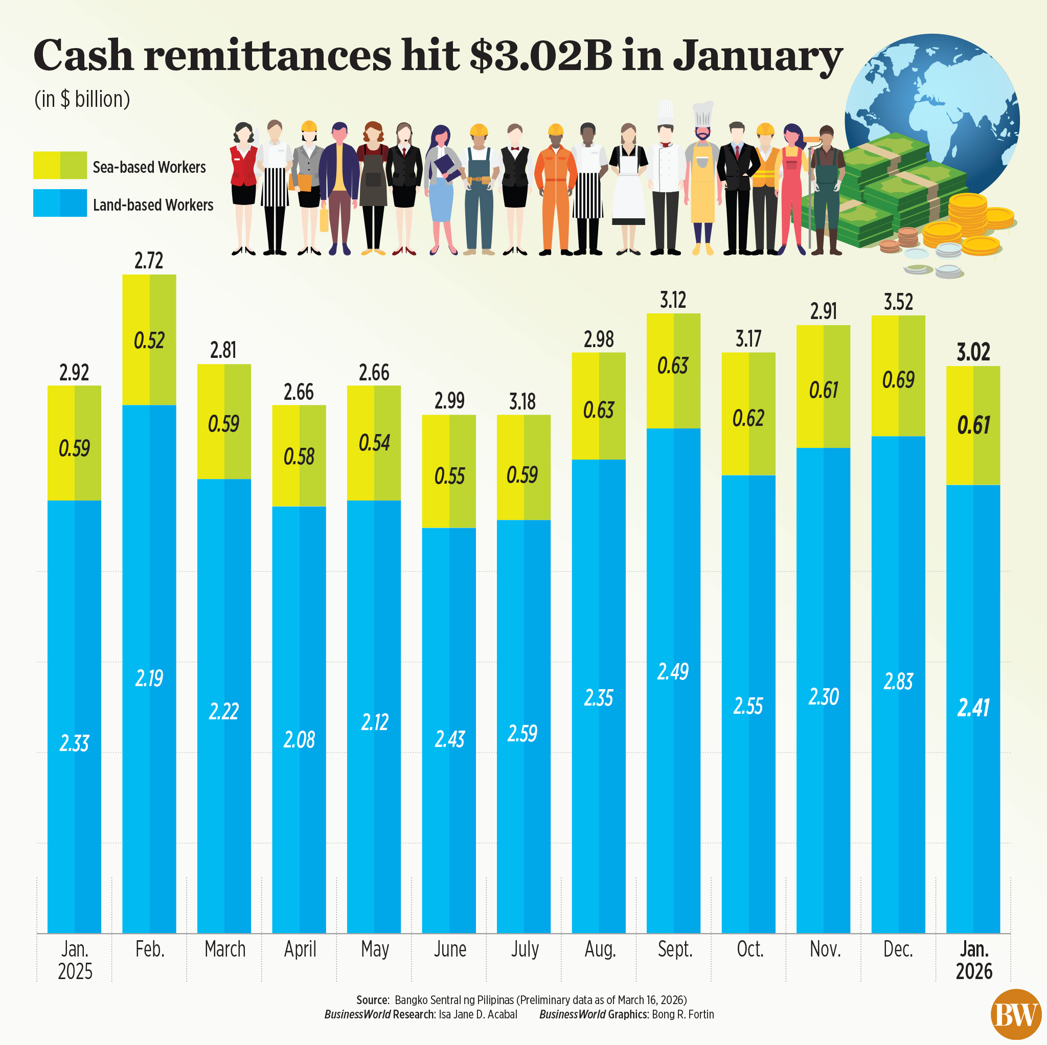 Cash remittances from land-based workers grew by 3.5% to $2.413 billion in January from $2.331 billion in the same month in 2025.