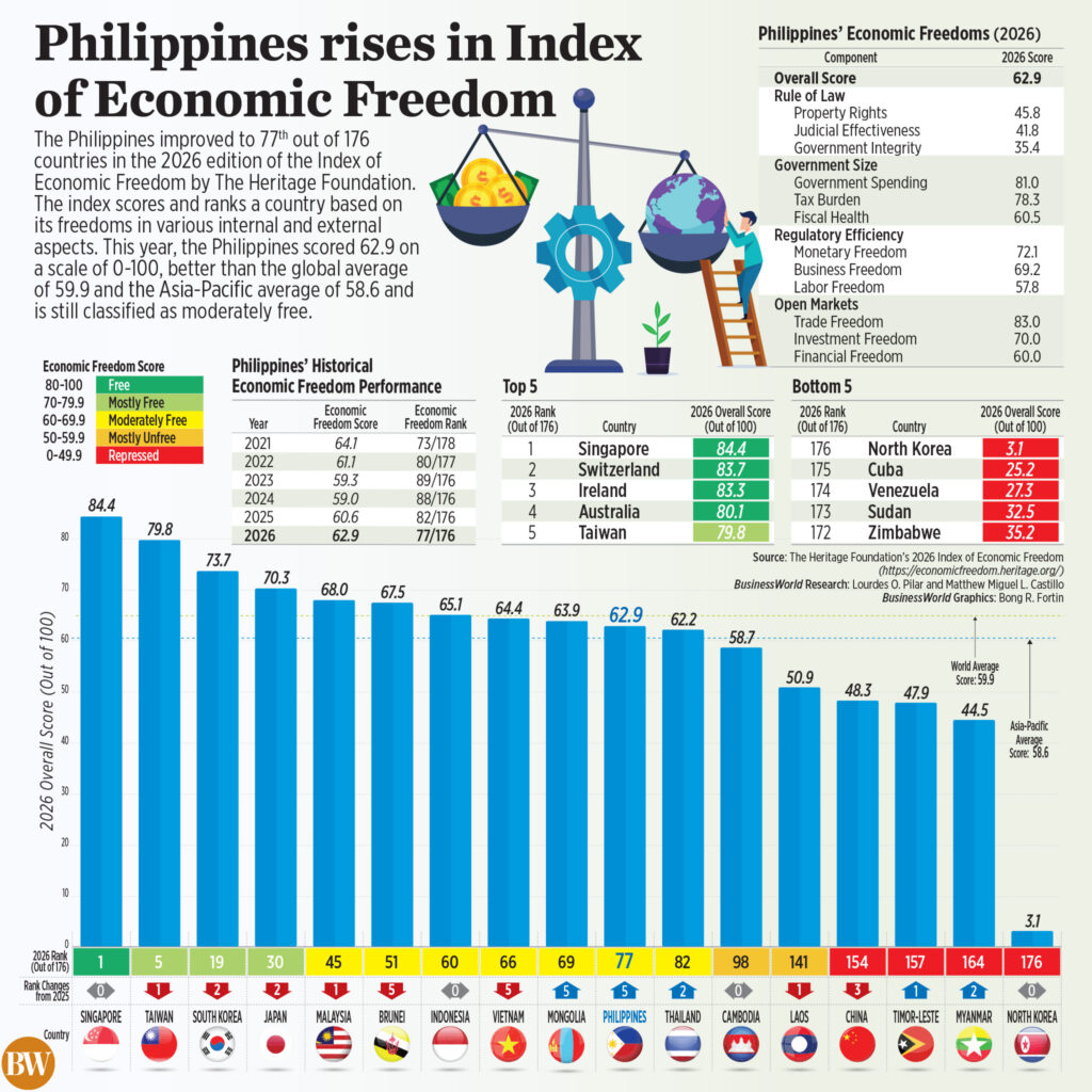 The Philippines’ latest ranking is equivalent to the economic freedom status of “moderately free” since 2025 when it ranked 82nd in the index.