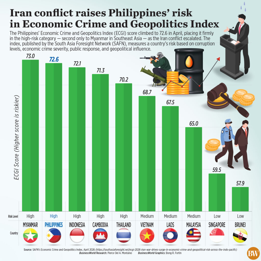 “The Iran war acts as a direct transmission mechanism of risk: energy shocks translate into fiscal pressure, social unrest, and increased opportunities for economic irregularities, reinforcing the Philippines’ high-risk classification,” he told BusinessWorld in an e-mail.