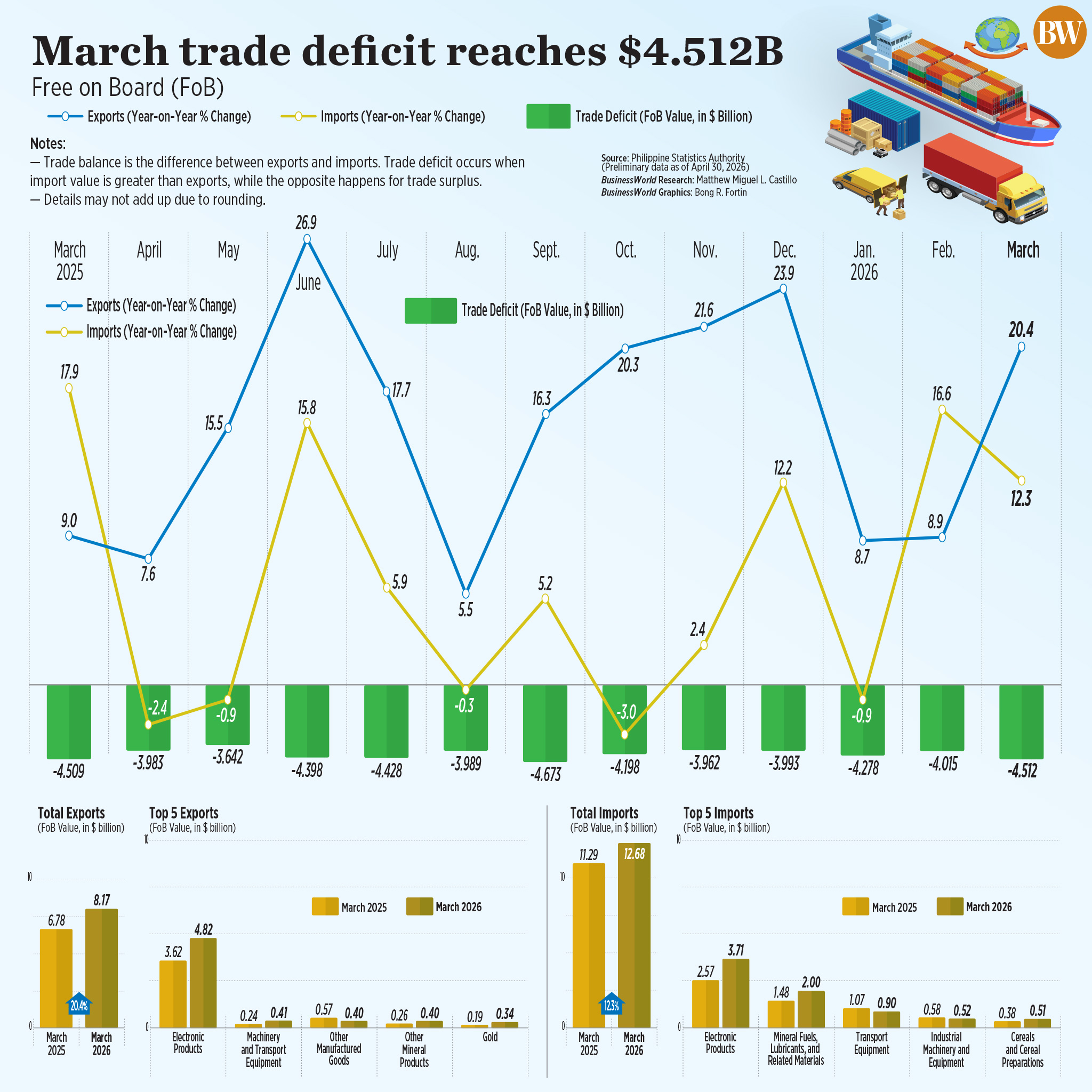 Preliminary data from the PSA showed the country’s trade-in-goods balance — the difference between exports and imports — stood at a deficit of $4.512 billion in March, widening by 0.1% from the $4.509-billion deficit in March last year.