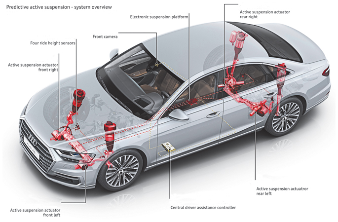 FITTED to its flagship Audi A8 L luxury sedan, Audi’s proprietary intelligent predictive active suspension allows the car to deliver, depending on the chosen settings, “the supreme ride comfort of a chauffeur-driven limousine, or the firm handling of a sports car.”